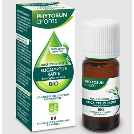 L'Huile Essentielle d'Eucalyptus radié Phytosun Aroms est obtenue par distillation des feuilles d'Eucalyptus radiata issu de l'agriculture biologique. Les molécules obtenues sont le 1,8-cinéole, l'alpha-terpinéol et les citrals.