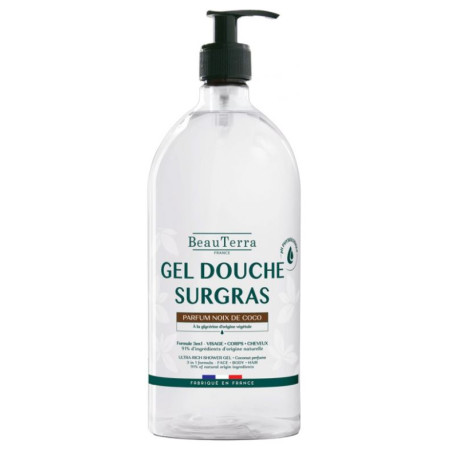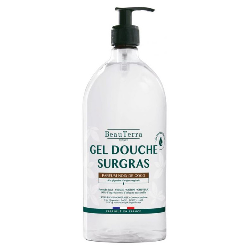 BeauTerra Gel Douche Surgras Figue 1 L est un soin d'hygiène quotidien formulé avec soin pour répondre aux besoins de toute la famille dès 3 ans.