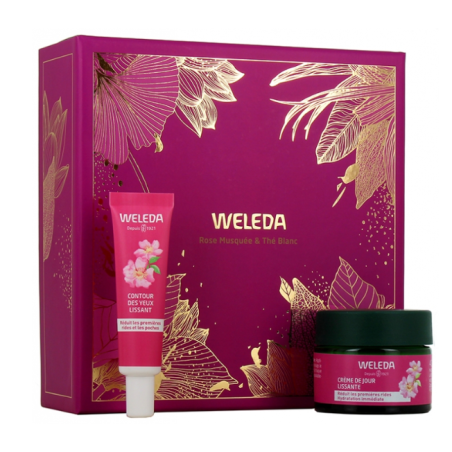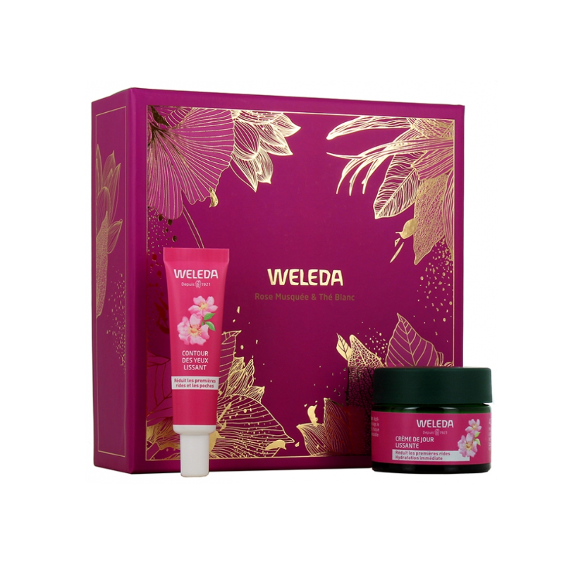 Weleda Crème de Jour Lissante à la Rose Musquée 40 ml : Water (Aqua), Glycerin, Prunus Armeniaca (Apricot) Kernel Oil+, Orbignya Oleifera Seed Oil, Helianthus Annuus (Sunflower) Seed Oil+, Rosa Moschata Seed Oil+, Pentylene Glycol, Arachidyl Alcohol, Hectorite, Behenyl Alcohol, Tapioca Starch, Camellia Sinensis Leaf+ Extract, Equisetum Arvense Extract, Betaine, Alcohol denat., Xanthan Gum, Carrageenan, Citric Acid, Tocopherol, Arachidyl Glucoside, Caprylyl Glycol, Sodium Stearoyl Glutamate, Fragrance (Parfum)*, Limonene*, Linalool*, Citronellol*, Geraniol*, Citral* *from natural essential oils +from organic cultivation Weleda Contour des Yeux Lissant à la Rose Musquée 12 ml : water (Aqua), Glycerin, Alcohol denat., Prunus Armeniaca (Apricot) Kernel Oil+, Rosa Moschata Seed Oil+, Sorbitan Stearate, Camellia Sinensis Leaf Extract, Euphrasia Officinalis+ Extract, Punica Granatum Extract, Euphorbia Cerifera (Candelilla) Wax, Helianthus Annuus (Sunflower) Seed Oil+, Betaine, Lactobacillus Ferment Lysate, Hectorite, Xanthan Gum, Carrageenan, Lactobacillus Ferment, Caffeine, Tocopherol, Glyceryl Caprylate, Sodium Stearoyl Glutamate, Sucrose Cocoate. +from organic cultivation