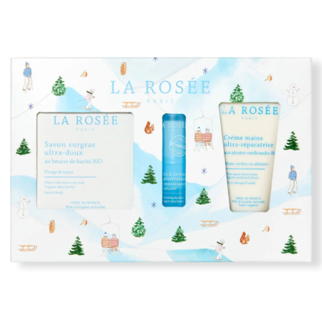 - Savon surgras : SODIUM OLIVATE, SODIUM COCOATE, SODIUM STEARATE, AQUA (WATER), PARFUM (FRAGRANCE), GLYCERIN, BUTYROSPERMUM PARKII (SHEA) BUTTER, SODIUM CHLORIDE, TETRASODIUM GLUTAMATE DIACETATE, BENZYL BENZOATE, LINALOOL, ALPHA-ISOMETHYL IONONE, CITRONELLOL, COUMARIN, GERANIOL. 0% paraben, huiles minérales, phénoxyéthanol, laurylsulfate, phtalates, aluminium, triclosan, MIT, benzophénones, BHA, alkylphénols, lilial, PEG, formaldéhyde, silicones, perturbateurs endocriniens, EDTA. Stick lèvres : RICINUS COMMUNIS (CASTOR) SEED OIL, COCOGLYCERIDES, HELIANTHUS ANNUUS HYBRID OIL (HELIANTHUS ANNUUS (SUNFLOWER) SEED OIL), OLEIC/LINOLEIC /LINOLENIC POLYGLYCERIDES, HELIANTHUS ANNUUS (SUNFLOWER) SEED WAX, BUTYROSPERMUM PARKII (SHEA) BUTTER, TRIBEHENIN, HYDROGENATED CASTOR OIL, CERA ALBA (BEESWAX), PARFUM (FRAGRANCE), COPERNICIA CERIFERA (CARNAUBA) WAX, HELIANTHUS ANNUUS (SUNFLOWER) SEED OIL, TOCOPHEROL, ASCORBYL PALMITATE Crème mains : AQUA (WATER), ALOE BARBADENSIS (ALOE) LEAF EXTRACT, BUTYROSPERMUM PARKII (SHEA) BUTTER, COCOS NUCIFERA (COCONUT) OIL, GLYCERYL STEARATE SE, CETEARYL ALCOHOL, GLYCERIN, CALENDULA OFFICINALIS FLOWER WATER, ARNICA MONTANA FLOWER EXTRACT, HELIANTHUS ANNUUS (SUNFLOWER) SEED OIL, SODIUM HYALURONATE, XANTHAN GUM, CITRIC ACID, GLUCONOLACTONE, PARFUM (FRAGRANCE), GLYCERYL STEARATE CITRATE, CALCIUM GLUCONATE, SODIUM DEHYDROACETATE, SODIUM HYDROXIDE, POTASSIUM SORBATE, SODIUM BENZOATE, BENZYL ALCOHOL, CITRONELLOL, LINALOOL, GERANIOL. 0% paraben, huiles minérales, phénoxyéthanol, laurylsulfate, phtalates, aluminium, triclosan, MIT, benzophénones, BHA, alkylphénols, lilial, PEG, formaldéhyde, silicones, perturbateurs endocriniens, EDTA.
