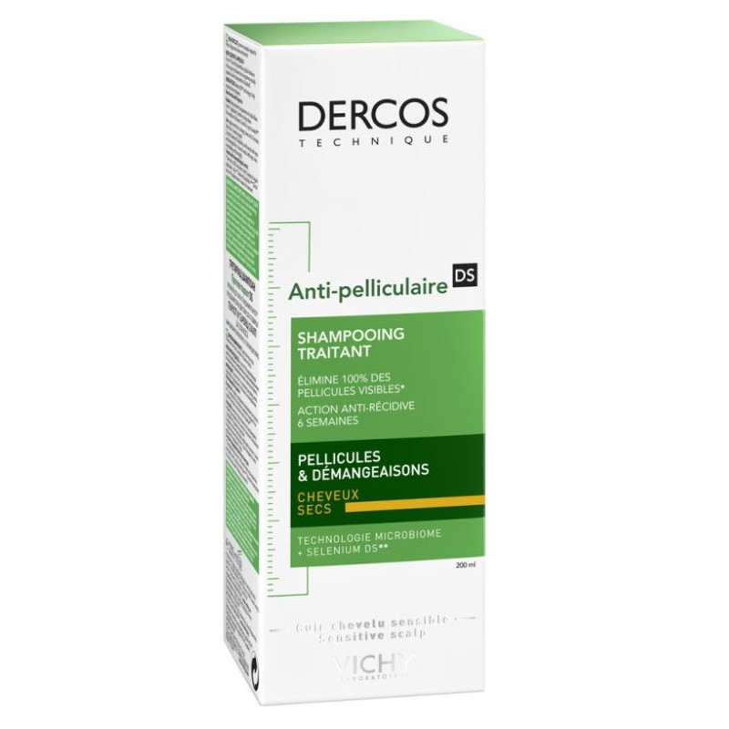 Vichy Dercos Shampoing Traitant Anti-Pelliculaire DS Cheveux Secs 200ml est un shampoing antipelliculaire pour cheveux secs et cuir chevelu sensible. Il élimine les pellicules visibles afin de soulager les démangeaisons.
