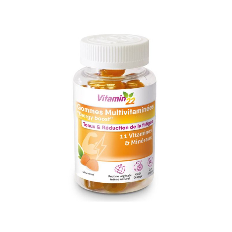 Les Gommes Vitamin’22 Multivitaminées « Energy boost » sont idéales pour tous les adultes qui souhaitent retrouver rapidement tonus et vitalité avec une prise facilités grâce à des gommes aux délicieux goût Orange.