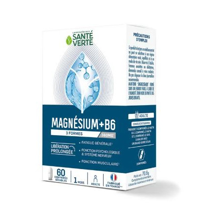Magnésium 3 formes dosé à 360mg* + 1,4mg de Vitamine B6. Le Magnésium¹ contribue :